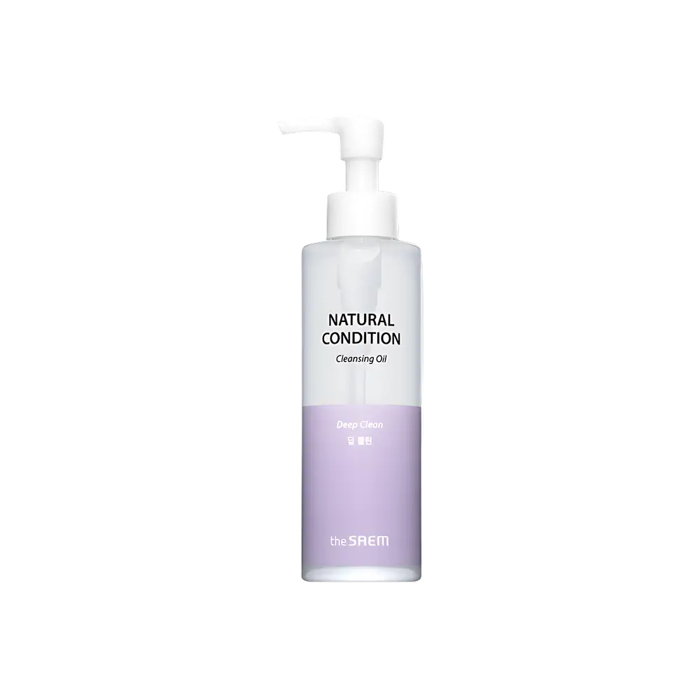 Aceite limpiador Natural Condition Cleansing Oil [Deep Clean] de The Saem, diseñado para una limpieza profunda que elimina maquillaje, impurezas y residuos acumulados en los poros. Su textura ligera se transforma en una emulsión lechosa al contacto con el agua, facilitando una limpieza completa sin dejar sensación grasosa.